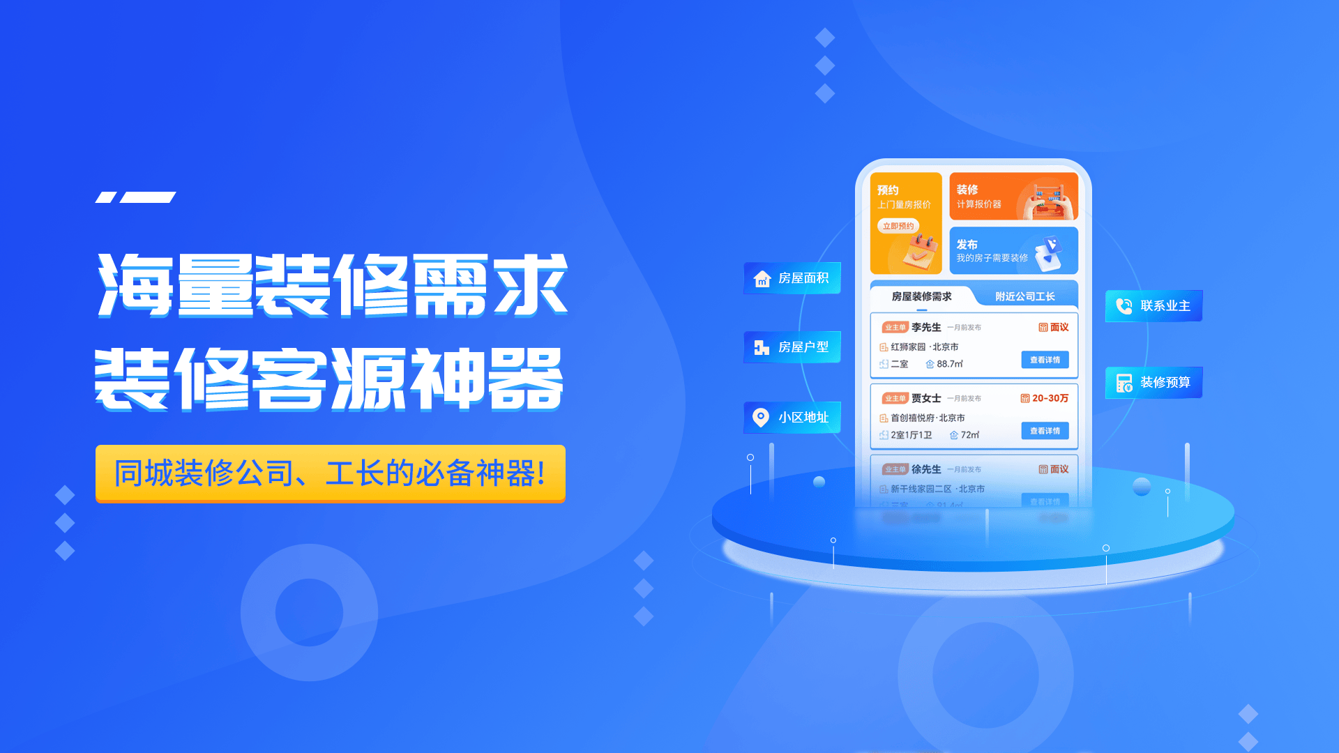 推送 “已确认预算、明白拆修时间” 的客户,拆修获客宝app派单模式大数据筛选高意向客户。拆修公司获客常陷 “广撒网、没结果”,拆企可针对性抢单,拆修公司精准获客不是少获客,用对东西对接需求,聚焦刚需工拆。获客高。而是获高质量客,